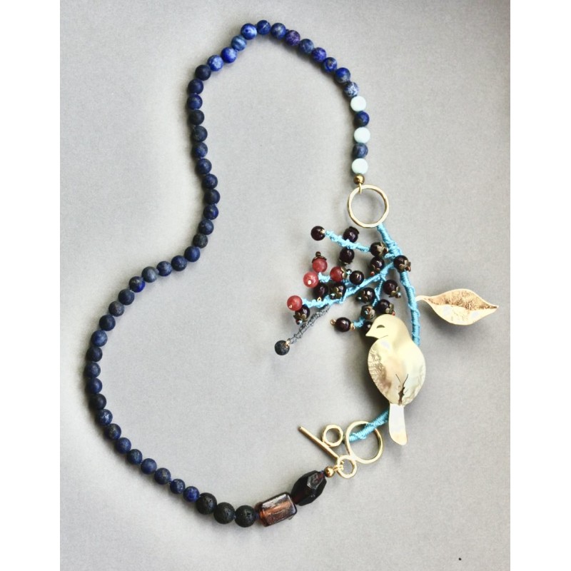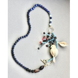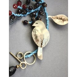 Collier Oiseau posé sur sa branche, pierres naturelles, fil laiton gainé, collier de perles montées nouées, fermoir OT